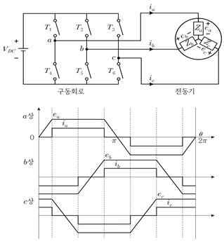 8. 그림과 같은 구동회로와 상 역기전력, 상전류를 갖는 전동기에 대한 설명으로 옳지 않은 것은?