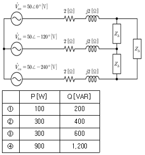 18. 그림의 회로에서 한 상의 부하가 Z△=3+j6[Ω]일 때, 3상 부하 전체의 유효전력 P[W]와 무효전력 Q[VAR]는? (단, 전압은 실횻값이다)