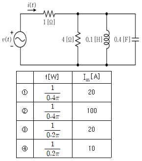 19. 그림의 회로에서 교류 전류의 진폭 Im[A]이 최소가 되는 주파수 f[Hz]와 이 주파수에서 전류의 진폭 Im[A]은? (단, v(t)=100sin(2πft)[V]이고, i(t)=Imsin(2πft+θ)[A]이다)