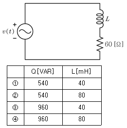 9. 그림의 회로에서 유효전력은 720[W]이고 역률은 0.6일 때, 무효전력 Q[VAR]와 인덕턴스 L[mH]은? (단, v(t)의 주파수는 1000/π[Hz]이다)