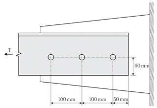 16. 그림과 같은 인장재 ㄱ형강의 블록전단강도 산정 시, 전단파단에 대한 전단저항 순단면적 Anv[mm2]는? (단, 볼트구멍의 직경 dh는 24mm이고, 부재의 두께 t는 10mm이다)