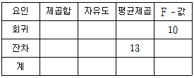 13. 다음은 자료 (xi, yi)(i = 1,2,…,12)에 단순선형회귀모형 yi = β0 + β1xi + εi를 최소제곱법으로 적합하여 얻은 분산분석표의 일부이다. 이 단순선형회귀모형에서 잔차제곱합의 자유도와 결정계수의 합은? (단, εi는 정규분포 N(0, σ2)을 따르고 서로 독립이다)