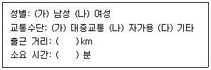 15. 어느 도시 직장인 1,500명을 임의추출하여 성별과 출근 교통수단은 해당 항목을 선택하게 하고, 출근 거리와 소요 시간은 직접 작성하도록 하는 다음과 같은 설문조사를 실시했다.