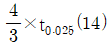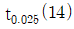 18. 어떤 회사에서 생산하는 건전지의 평균 수명은 300일이라고 알려져 있다. 이를 확인하기 위하여 건전지 15개를 임의추출하여 구한 평균 수명(단위: 일)에 대한 95% 신뢰구간은 (296,308) 이었다. 귀무가설 “건전지의 평균 수명은 300일이다.”와 대립가설 “건전지의 평균 수명은 300일이 아니다.”에 대한 검정에서 t-검정통계량의 값과 같은 것은? (단, 건전지의 수명은 정규분포를 따른다고 하며, tα(k)는 자유도가 k인 t분포의 제100×(1-α) 백분위수를 나타낸다)