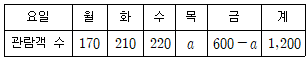 20. 어느 극장에서 월요일부터 금요일까지 관람객 수의 비율이 1 : 1 : 1 : 1 : 2 인지를 검정하고자 평일 관람객 1,200 명을 조사하여 다음 표와 같이 정리했다.