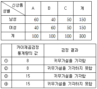 5. 어느 회사에서 남성 150명과 여성 150명을 임의추출한 후 세 종류의 신상품 A, B, C에 대한 선호도를 조사하여 다음과 같은 분할표를 얻었다. “성별에 따른 신상품 선호도에 차이가 없다.”라는 귀무가설을 검정하기 위한 카이제곱검정통계량의 값과 유의수준 5%에서 검정한 결과를 바르게 연결한 것은? (단,