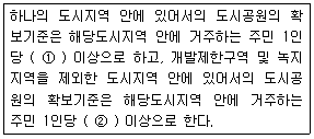 96. 다음은 도시공원 및 녹지 등에 관한 법규에 따른 도시공원의 면적기준에 대한 설명이다. ( ① )과 ( ② )에 들어갈 말이 모두 옳은 것은?