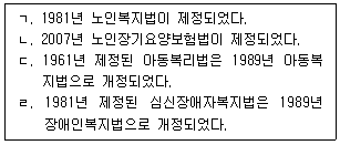 4. 사회복지정책의 역사를 세 단계로 나눌 때 ( )에 들어갈 내용을 순서대로 나열한 것은?