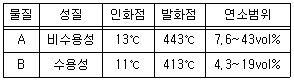 81. 물질 A와 B의 특성이 다음과 같을 때 공기중에서 인화 또는 발화가 가능한 조건은? (단, 물질 A는 물 또는 물질 B와 혼합하여도 화학반응 등이 일어나지 않는 것으로 한다.)