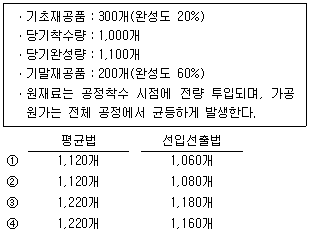 10. 종합원가계산을 적용할 경우, 다음의 자료를 이용하여 평균법과 선입선출법에 따른 가공원가의 완성품환산량을 각각 계산하면 몇 개인가?