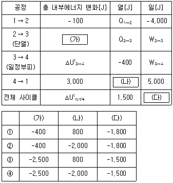 16. 닫힌 계에서 기체가 다음과 같이 4단계의 열역학적 가역공정 사이클을 거칠 때, (가)~(다)의 값[J]을 바르게 연결한 것은? (단, ∆Ut는 계의 총 내부에너지 변화이고, 계로 유입되는 Q(열)와 W(일)는 양(+)의 값으로 나타낸다)