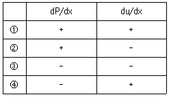 7. 압축성 유체의 흐름 속도가 음속보다 느릴 때, 노즐의 단면적이 감소하는 수평 수렴노즐에서 흐름 방향으로의 압력구배(dP/dx)와 속도구배(du/dx)의 부호를 바르게 연결한 것은? (단, 흐름은 열역학적 가역흐름이다)