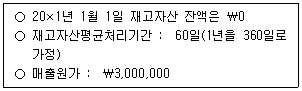 17. 다음 자료를 이용한 (주)한국의 20×1년 기말재고자산 금액은? (단, 회전율 계산 시 기초와 기말의 평균값을 이용한다)