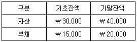 5. (주)한국의 자산과 부채에 대한 자료는 다음과 같으며, (주)한국은 기중에 ₩2,000의 주식배당을 실시하였다. (주)한국의 당기순이익이 ₩5,000인 경우, 당기의 기타포괄손익은?