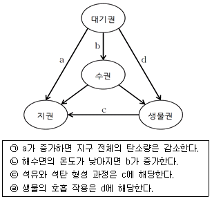 19. 다음 그림은 지구계 탄소 순환의 일부 과정을 표시한 것이다. 이에 대한 설명으로 옳은 것만을 보기에서 있는 대로 고른 것은?