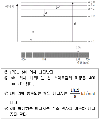 9. 다음 그림은 수소 원자에서 일어나는 전자 전이 a~d와, 수소 원자의 가시광선 영역의 선 스펙트럼을 나타낸 것이다. 이에 대한 설명으로 옳은 것만을 보기에서 있는 대로 고른 것은? (단, 수소 원자의 에너지 준위는