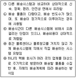 77. 배송시스템은 배송업체의 개별적인 여건과 배송되는 제품특성에 따라 생산자 집약형 배송시스템과 프랜차이즈 방식의 배송시스템, 그리고 택배 서비스로 구별해 볼 수 있다. 아래 글상자에서 생산자 집약형 배송시스템의 장단점을 모두 나열한 것으로 옳은 것은?(오류 신고가 접수된 문제입니다. 반드시 정답과 해설을 확인하시기 바랍니다.)