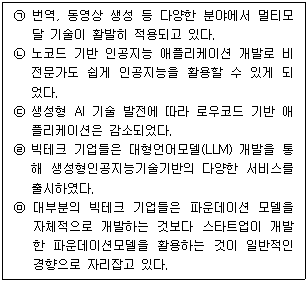 84. 유통업체에서의 생성형 인공지능 기술 활용이 증가하고 있다. 다음 생성형 인공지능 기술 활용에 대한 설명으로 가장 옳지 않은 것은?