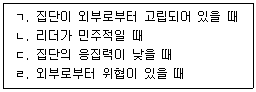 65. 제니스(I. Janis)가 제시한 집단사고(groupthink)가 발생할 가능성이 높은 상황을 모두 고른 것은?