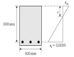15. 그림과 같은 철근콘크리트 보의 단면과 변형률 분포에서 설계휨강도를 계산할 때, 중립축 깊이 c[mm]의 값은? (단, 최외단 인장철근의 순인장변형률 εt는 0.0099, 콘크리트의 설계기준압축강도 fck는 27MPa, 단면의 유효깊이는 600mm, εcu는 콘크리트의 극한변형률이다)