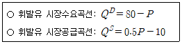 12. 다음은 완전경쟁시장에서의 휘발유에 대한 시장수요곡선과 시장공급곡선이다. 정부가 휘발유 공급자에게 단위당 3의 종량세를 부과할 때, 옳지 않은 것은? (단, P는 휘발유 가격이고, QD와 QS는 각각 휘발유에 대한 수요량과 공급량이다)