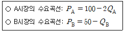 19. 어느 독점기업은 판매 지역을 A시장과 B시장으로 구분하여 이윤을 극대화하고자 한다. 이 기업의 해당 상품에 대한 한계비용은 20이고 A시장과 B시장에 대한 수요곡선은 다음과 같을 때, A시장과 B시장에서의 판매 가격 차이는? (단, PA와 QA는 각각 A시장에서 가격과 수량이고, PB와 QB는 각각 B시장에서 가격과 수량이다)