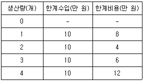 20. 어느 기업이 생산하는 제품에 대한 한계비용과 한계수입은 다음과 같다. 이 기업은 해당 제품을 최대 4개까지 생산할 수 있고, 생산을 하지 않더라도 공장 유지비 2만 원을 고정적으로 지출한다. 이에 대한 설명으로 옳은 것은?