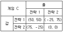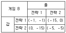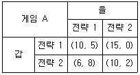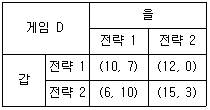 5. 갑과 을 두 사람은 다음의 전략 게임을 하고 있고, 게임별로 각자의 전략에 따라 보수 역시 달라진다. 우월전략균형이 존재하지 않는 것은? (단, 괄호 안의 앞의 숫자는 갑의 보수, 뒤의 숫자는 을의 보수이다)