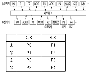 11. 다음 Go-Back-N ARQ(Automatic Repeat reQuest)를 사용하는 송신기기와 수신기기 사이에 주고받은 통신 패킷 중 (가), (나)에 들어갈 내용을 바르게 연결한 것은? (단, 윈도 크기는 3이다)