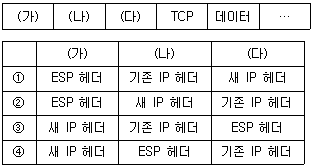 20. 터널 모드로 동작하는 IPSec의 ESP(Encapsulating Security Payload) 프로토콜에서 사용하는 다음 패킷의 구조 (가)~(다)에 들어갈 내용을 바르게 연결한 것은? (단, 패킷의 버전은 IPv4이다)