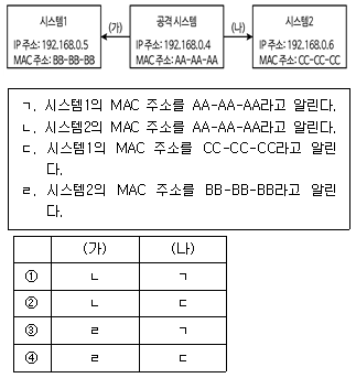 8. 다음 랜(LAN)에서 '공격시스템'이 ARP 스푸핑(spoofing) 공격을 위해 (가), (나)에서 수행하는 작업을 ㄱ~ㄹ에서 찾아 바르게 연결한 것은? (단, MAC 주소는 24비트로 가정한다)