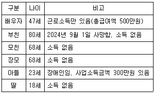 12. 다음은 거주자 甲(50세, 남성)의 2024년 12월 31일 현재 배우자와 생계를 같이하는 부양가족 관련 자료이다. 소득세법령상 甲의 2024년 귀속 종합소득과세표준을 계산할 때 종합소득금액에서 공제되는 인적공제의 합계액은? (단, 배우자가 인적공제를 받거나 배우자와 부양가족이 다른 거주자의 인적공제 대상에 해당되는 경우가 아니며, 인적공제의 합계액은 종합소득금액을 초과하지 않는다)